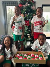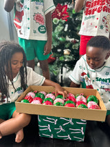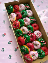 A joyful assortment of 28 Christmas-themed donuts, decorated in festive reds, greens, and soft pinks. Each donut is topped with seasonal sprinkles, holiday glazes, and adorable candy-cane accents. A bright, cheerful box made to share — perfect for parties, gifting, or bringing Christmas spirit to any celebration!