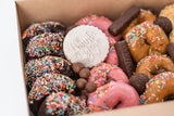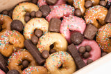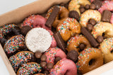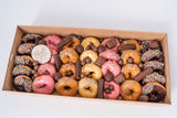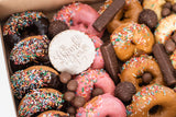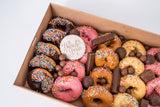 30 mixed iced donuts standard colours and sprinkles, chocolates and a cookie either Happy Birthday, Enjoy or thank-you written on it . Please specify in the notes which cookie.