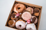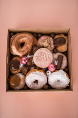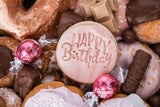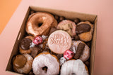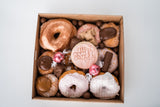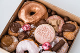Beautiful pinks and vanilla glazed donuts with perfectly placed chocolates perfect and ready to add to Your Instagram add her favourite alcohol or more on our extras page to add a personal touch.!