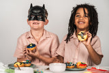 Have fun playing Batman with all your friends decorating with dark colour icing and bright yellows to give the Batman feel to your donuts have fun decorating and eating Batman and his bat friends !